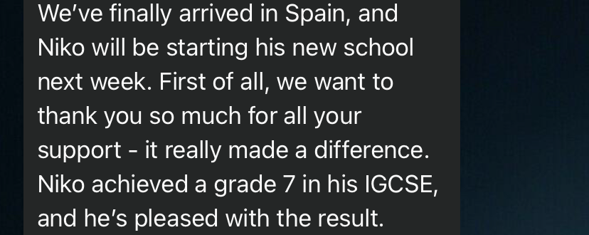 After 4 months of weekly lessons, targeted writing corrections and timed listening practice, his final school mock jumped to a strong 7. On the real exam he felt calm and said the writing paper was ‘exactly like what we practised’